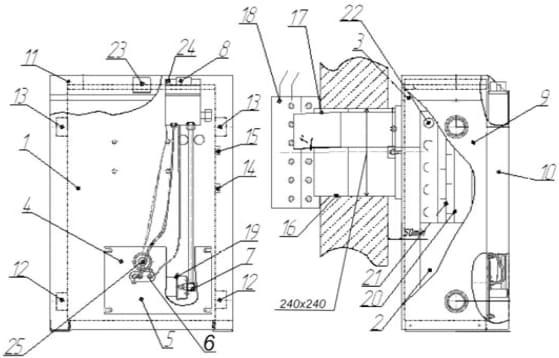 1 — теплообмінник жаротрубний; 2 - топка; 3 — збірник продуктів згоряння; 4 — газогарячий пристрій; 5 - фронтальний лист; 6 — вузол запальника; 7 - колектор; 8 - газова автоматика; 9 - стінка бічна; 10 - стінка передня; 11 - стінка верхня; 12 — патрубок зворотного трубопроводу системи опалення; 13 — патрубок для підведення трубопроводу системи опалення; 14 — патрубок входу холодної води ГВС (для двоконтурних котлів); 15 — патрубок виходу гарячої води ГВС (для двоконтурних котлів); 16 — повітрозабірний короб; 17 — короб видалення продуктів згоряння; 18 — кожух вітрозахисний; 19 - пальник; 20-цілокатні котлові труби; 21 — турбулізатори з неіржавкої сталі; 22 — теплообмінник ГВС (для двоконтурних котлів); 23 - термометр; 24 - п'єзорозиг; 25 — оглядове вікно.